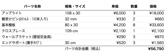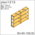 イキクッカのシステムパーツを組み合わせて作った 高さ108cm、奥行30cm、横幅165cmの本棚/収納棚のプランです。