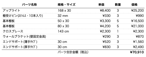 イキクッカのシステムパーツを組み合わせて作った 高さ168cm、奥行30cm、横幅135cmの本棚/収納棚のプランです。